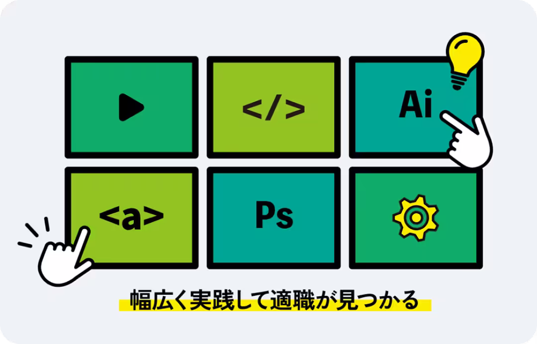 PC基礎からデザイン・動画編集・プログラミング 幅広く実践しながら、 自分に合うキャリアを見つけられる
